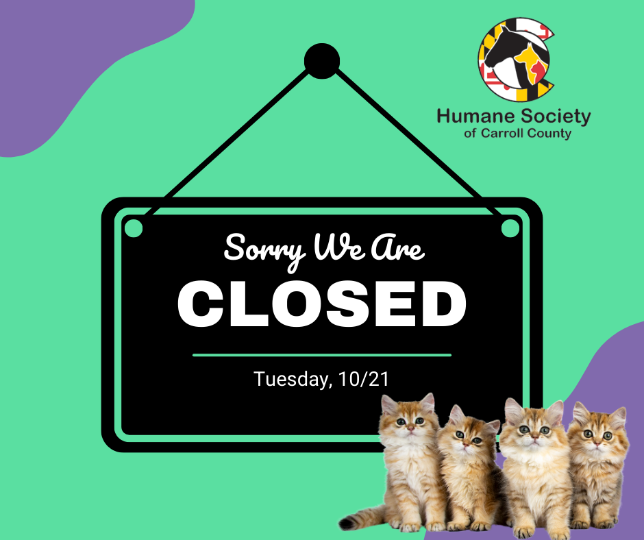 The Humane Society of Carroll County will be closed on Tuesday, October 21st for a routine maintenance and cleaning day.